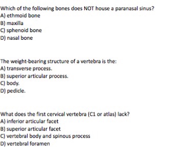 The reason why the nasal bone does not house a paranasal sinus is because of all the blood vessels are packed in near the septum. Ethmoid bone maxilla sphenoid bone nasal bone The weight bearing structure of a vertebra is the. Which of the following bones does not house a sinus.